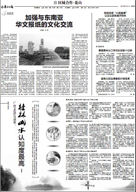 编者按:《广西日报》3月30日第八版以《广西文化符号调查:桂林山水认知度最高》为题关注广西文科中心桂学研究团队“广西文化符号影响力调查及研究”课题组所进行的广西文化符号调查活动。人民网、新华网、中国新闻网、中国文明网、中国国学网等媒体和网站进行了转载。据悉,课题组于3月22日在南宁公布了《广西文化符号影响力调查报告》,发布了该课题的阶段性成果。调查结果显示,文化符号“广西师范大学”入选最具代表性的十大广西文化符号。现将《广西日报》文章转载如下,以飨读者。