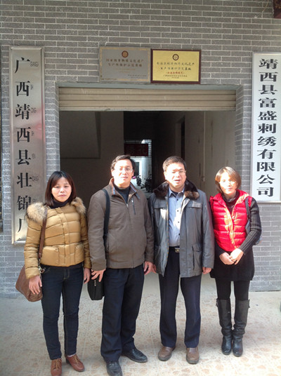 百色粤东会馆、百色起义纪念馆是中国红色文化的记载与传奇,调研组在考察中发现,百色的红色文化社会效益显著,而且经济效益进一步挖掘的空间极大。调研组考察的靖西县壮锦厂,始建于1956年,其生产的民族织锦获自治区质量第一名,其产品被定为全国生产少数民族用品定点企业。壮锦,与云锦、蜀锦、宋锦并称中国四大名锦,是广西民族文化瑰宝,壮族织锦技艺作为国家级非物质文化遗产,在这里得到了较好的传承。旧州绣球被称为壮乡文化使者,在旧州村,从十来岁的小孩到七八十岁的老人,很多是绣绣球的高手,旧州因此被称为“绣球一条街”。 旧州绣球开发为旅游纪念品,目前获得了市场的认可。但通过调研发现,无论是壮锦还是绣球,目前市场开发的远远不够,文化与科技结合有限,壮族文化的产业化不足。