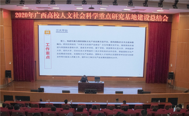 12月11日,由自治区教育厅主办、广西人文社会科学发展研究中心承办的2020年广西高校人文社会科学重点研究基地建设总结会在广西师范大学顺利召开。来自全区15所高校新一轮建设的30个广西高校人文社会科学重点研究基地负责人、专家学者及全区部分高校社会科学科研管理部门负责人等90余人参加会议。广西师范大学校长贺祖斌、自治区教育厅科研处处长黄青云出席会议并先后致辞。暨南大学原党委书记蒋述卓教授,南京大学社会科学处处长、国家首批协同创新中心-中国南海研究协同创新中心管理委员会副主任王月清教授,文化和旅游部-南京大学文化和旅游研究基地常务副主任、南京大学长三角文化产业发展研究院院长、江苏省文化产业学会会长、江苏文化产业研究基地主任顾江教授作为点评专家应邀参会。会议由广西师范大学社会科学研究处处长、广西人文社会科学发展研究中心常务副主任梁君教授主持。