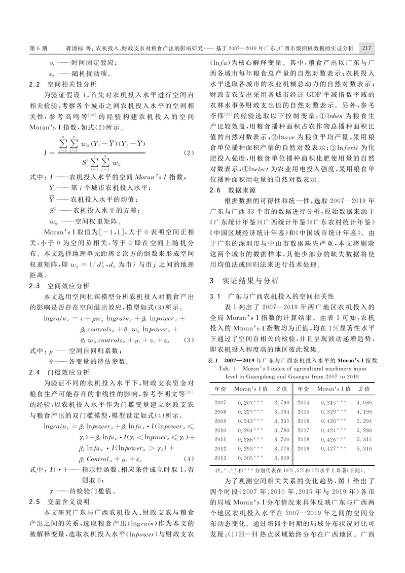 广西师范大学经济管理学院教授、广西师范大学珠江—西江经济带发展研究院研究员、广西师范大学西南城市与区域发展研究中心主任蒋团标和广西师范大学经济管理学院硕士生罗琳同学于《中国农机化学报》2021年第6期发表《农机投入、财政支农对粮食产出的影响研究——基于2007—2019年广东、广西市级面板数据的实证分析》一文。文章指出,提高粮食生产水平是保障中国粮食安全的关键,而农机投入和财政支农作为农业现代化的技术支持与政策保障是提升粮食产量的重要途径。基于此,以广东与广西33个城市2007—2019年的面板数据为对象,采用空间杜宾模型分析农机投入对粮食产出是否存在空间溢出效应,采用面板门槛模型分析财政支农支出对粮食产出是否存在非线性影响。结果表明:第一,农机投入存在显著的正向空间集聚效应,广东、广西农机投入水平呈现东低西高分布特征;第二,财政支农支出对粮食产出存在非线性的影响,随着农机投入水平的提高,财政支农支出促进粮食增产的作用呈“倒U型”态势。由此提出以下政策建议:一是广东与广西应优化农机装备产业结构布局;二是农机的推广要与各城市产业优势相结合;三是广东与广西都应加大粮食生产补贴与农机补贴支持力度,实现农户增收与粮食增产。