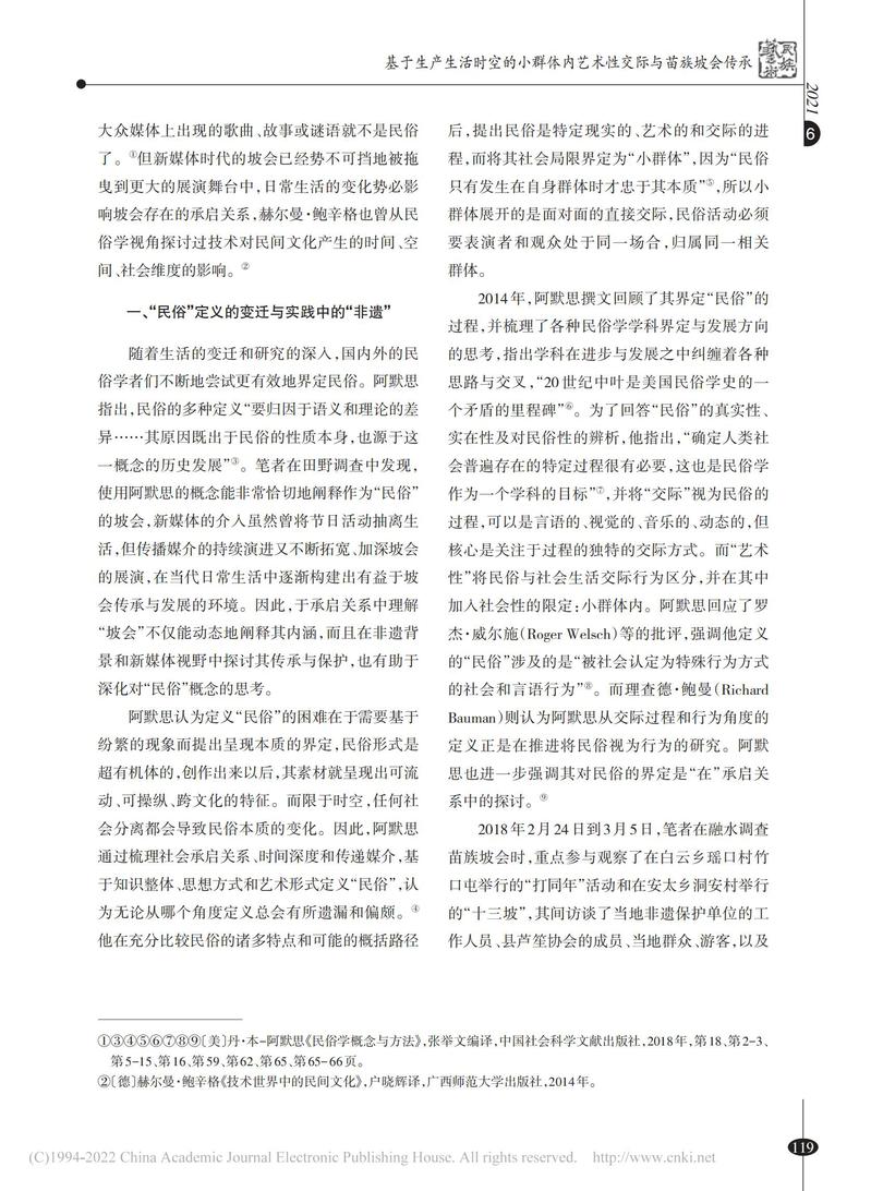 广西师范大学文学院/新闻与传播学院副教授、广西高校人文社科重点研究基地桂学研究院研究员龙晓添老师于《民族艺术》2021年第6期发表《基于生产生活时空的小群体内艺术性交际与苗族坡会传承》一文。文章指出,阿默思将民俗定义为“小群体内的艺术性交际”,从交际过程和行为角度强调面对面才能实现对民俗的建构与理解,其定义被认为推进了将民俗视为行为的研究。广西融水苗族自治县的坡会基于生产生活时空以艺术性交际的方式传承,纳入非物质文化遗产保护范围后,吸引了更多的关注,也面临着各种挑战。而随着网络社会进程的加深,新的传播形式和环境引领其走向更大的舞台。当代坡会正跨时空建构着新的意义与秩序,“小群体”所凝聚的历史感和认同感有助于弥合社会高速发展的冲击,同时,大舞台也为坡会构建了良好的发展环境,坡会的独特性使“小群体”在更大的社会结构中重新认识其价值和意义。