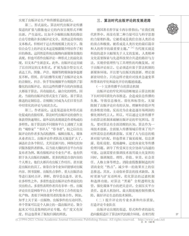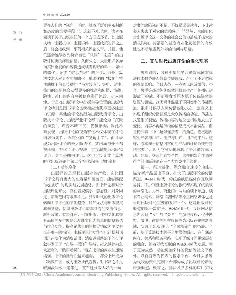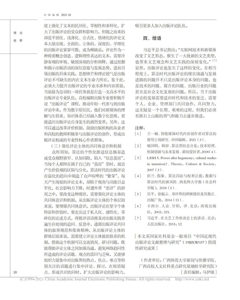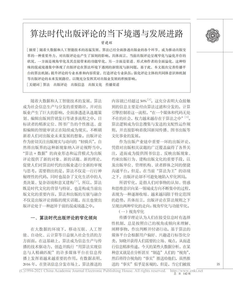 广西师范大学文学院/新闻与传播学院副教授、广西高校人文社科重点研究基地桂学研究院研究员曾建辉老师于《中国编辑》2021年第10期发表《算法时代出版评论的当下境遇与发展进路》一文。文章指出,随着大数据和人工智能技术的迅猛发展,算法已经全面渗透出版业的各个环节,成为推动出版变革的一种重要外力,对出版评论也产生了深刻的影响。具体而言,当前出版评论呈现窄化与溢化并存的状况,一方面是视角窄化及其直接带来的功能窄化,另一方面是渠道、形式和作者的全面溢化,这种特殊的混成境遇集中体现了出版评论在算法环境下遇到的新情况与新问题。基于此,本文提出完善传播平台的算法机制;提升评论的专业水准和内容质量,打造评论专业队伍;强化评论主体的共同体意识和机制等出版评论的未来发展路径,以期充分发挥其对出版业发展的积极影响。