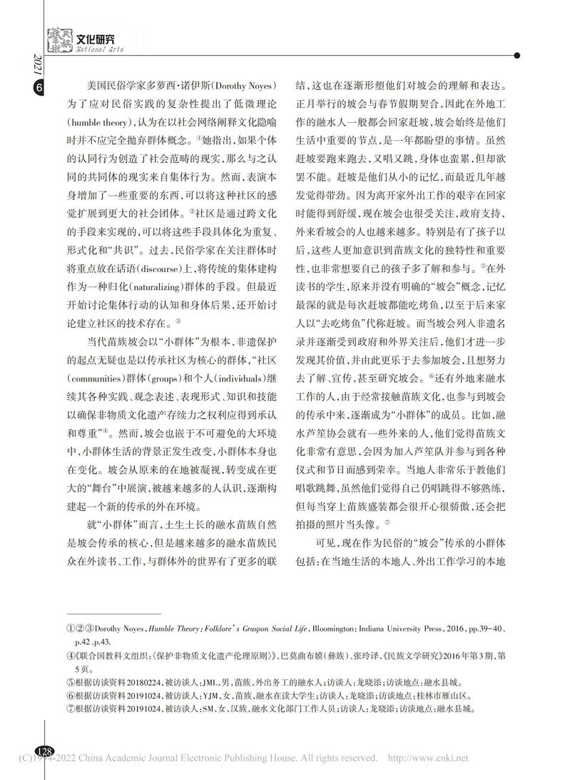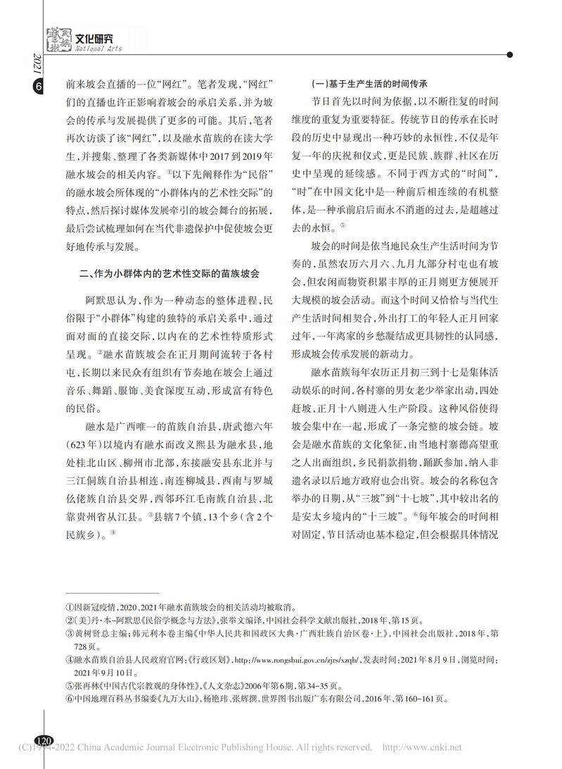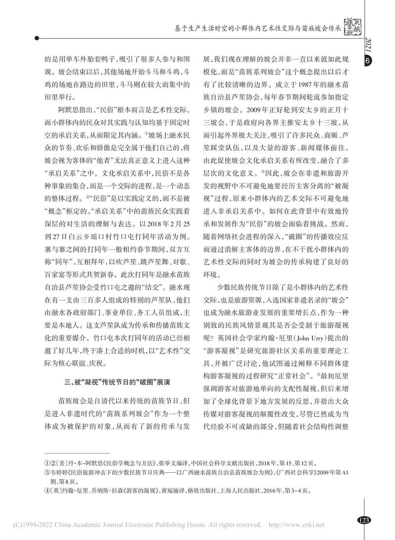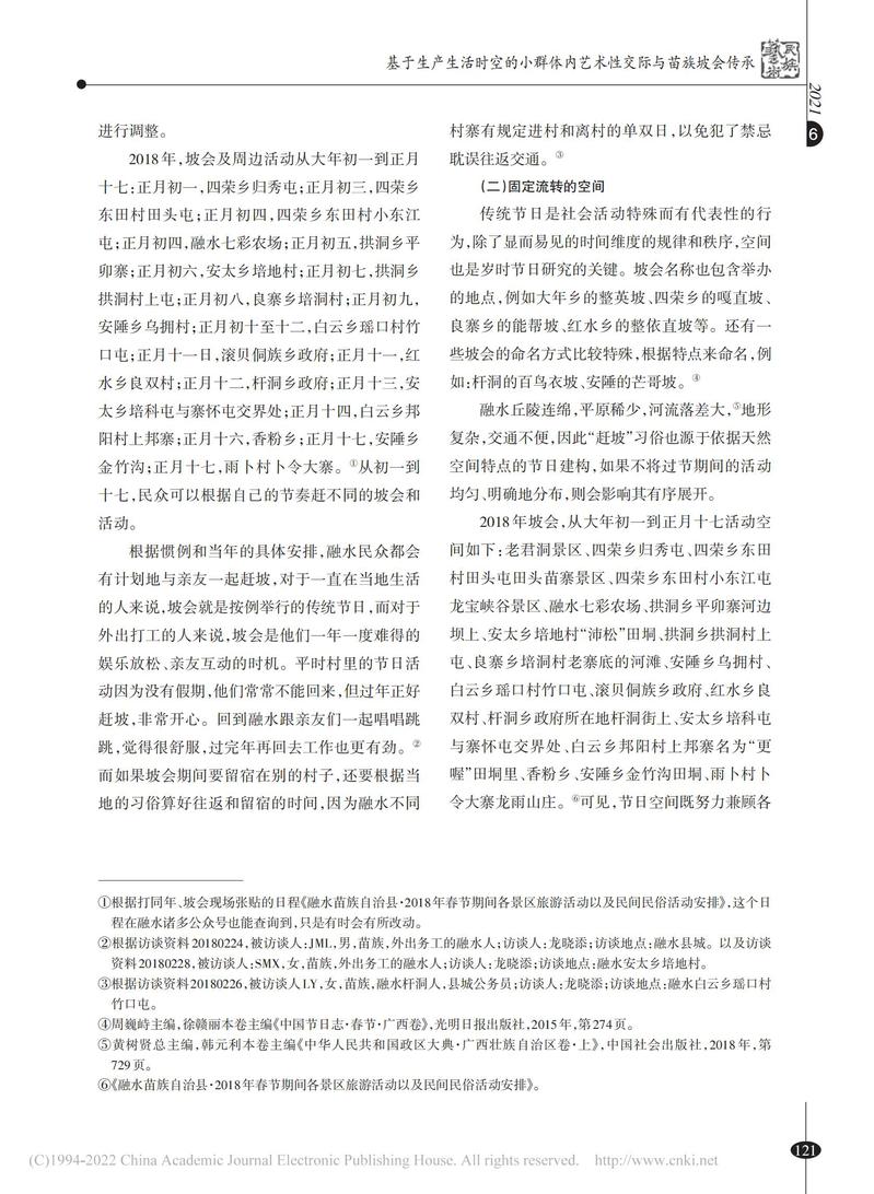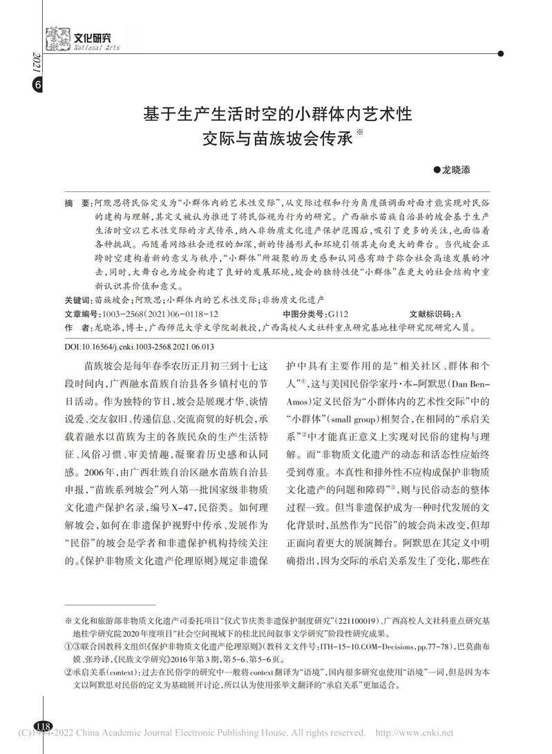 广西师范大学文学院/新闻与传播学院副教授、广西高校人文社科重点研究基地桂学研究院研究员龙晓添老师于《民族艺术》2021年第6期发表《基于生产生活时空的小群体内艺术性交际与苗族坡会传承》一文。文章指出,阿默思将民俗定义为“小群体内的艺术性交际”,从交际过程和行为角度强调面对面才能实现对民俗的建构与理解,其定义被认为推进了将民俗视为行为的研究。广西融水苗族自治县的坡会基于生产生活时空以艺术性交际的方式传承,纳入非物质文化遗产保护范围后,吸引了更多的关注,也面临着各种挑战。而随着网络社会进程的加深,新的传播形式和环境引领其走向更大的舞台。当代坡会正跨时空建构着新的意义与秩序,“小群体”所凝聚的历史感和认同感有助于弥合社会高速发展的冲击,同时,大舞台也为坡会构建了良好的发展环境,坡会的独特性使“小群体”在更大的社会结构中重新认识其价值和意义。