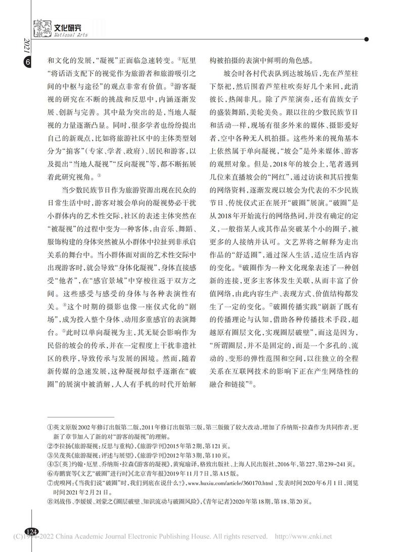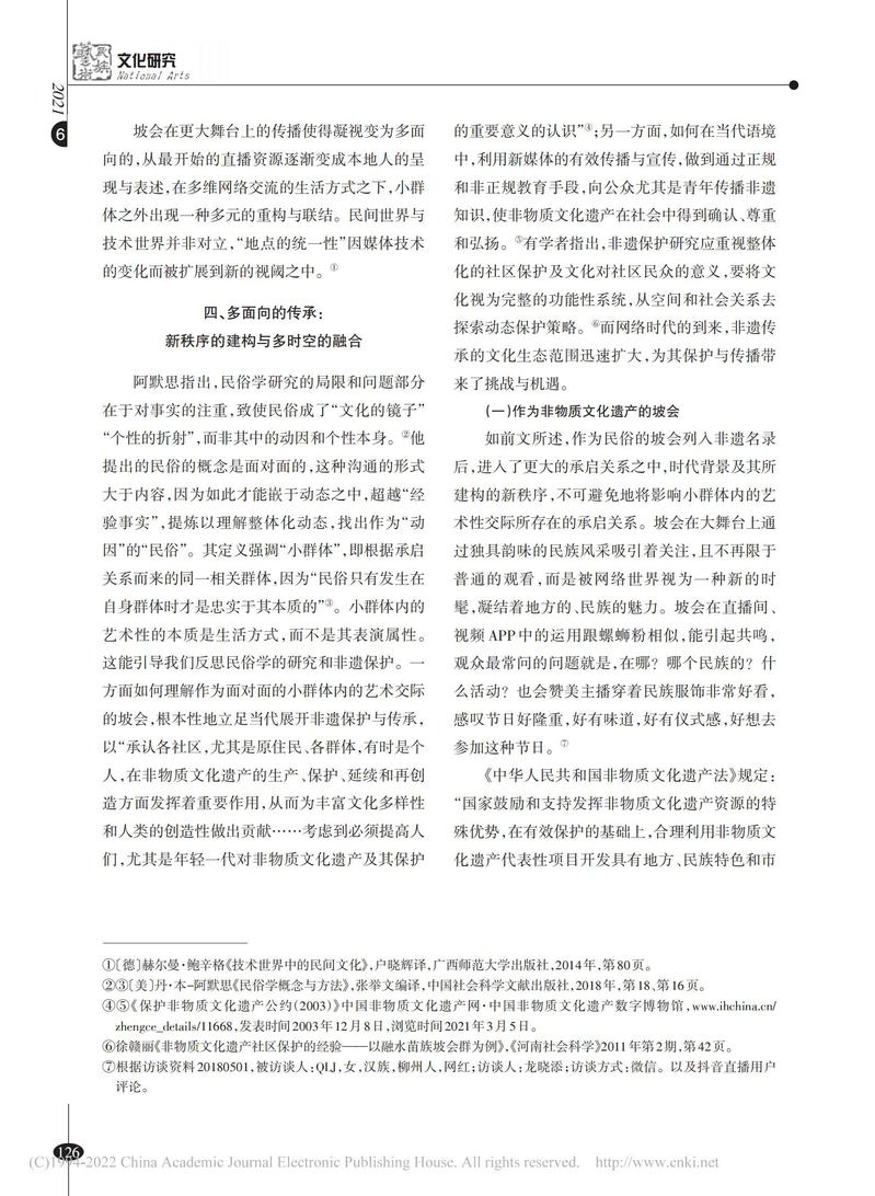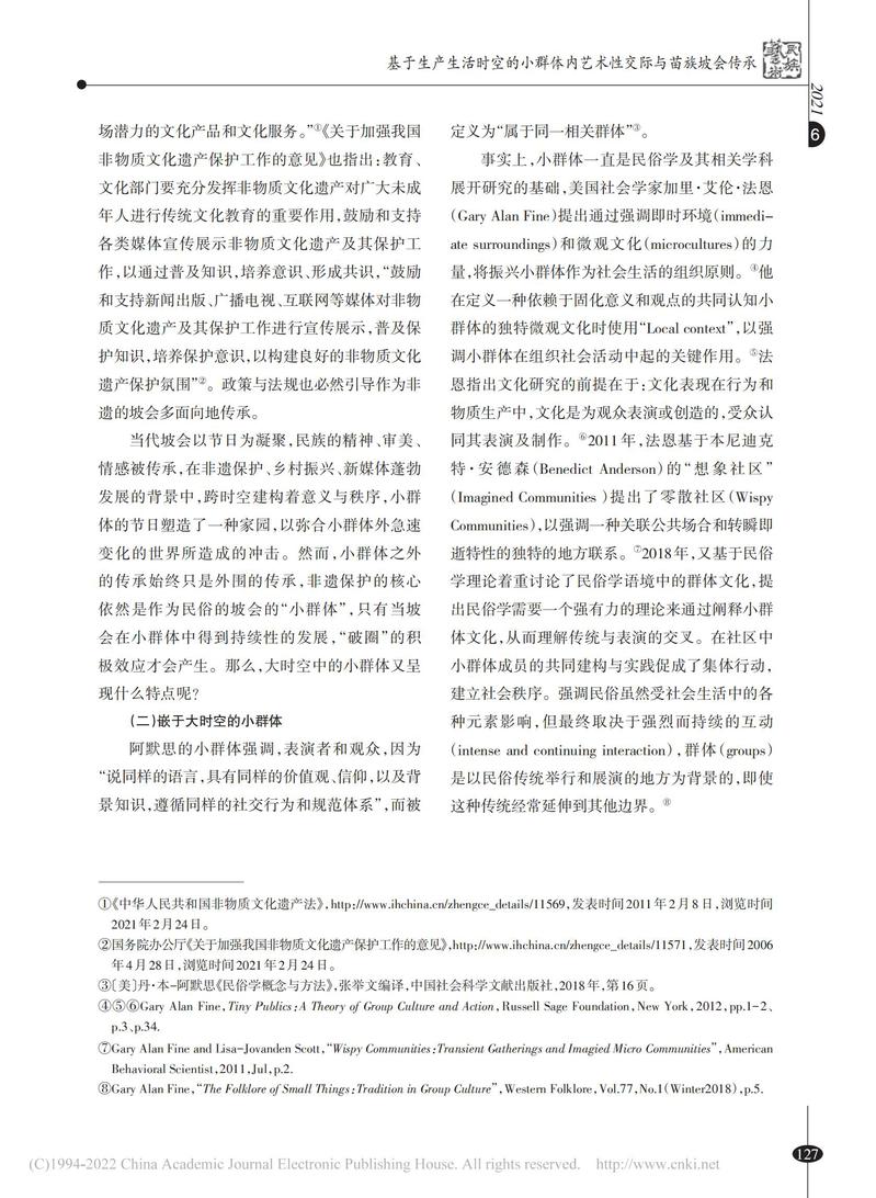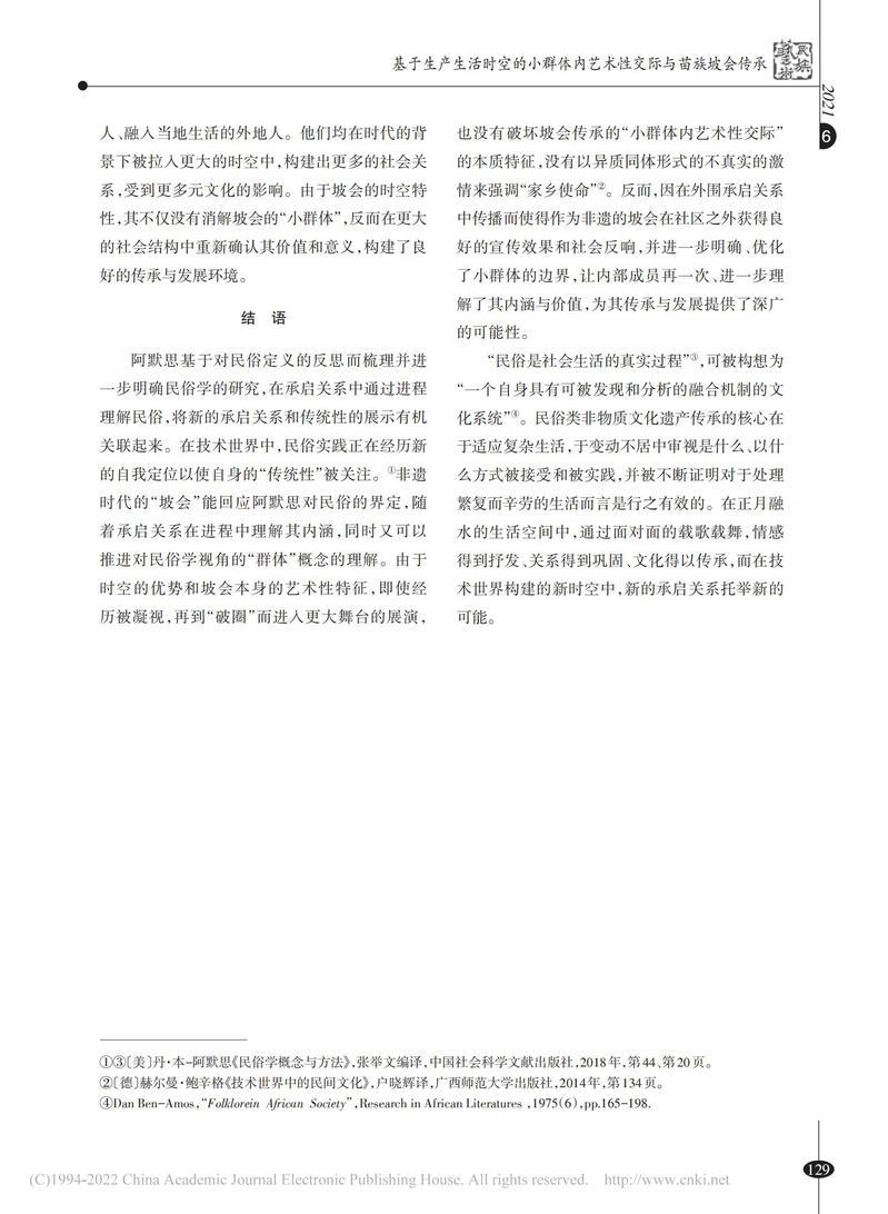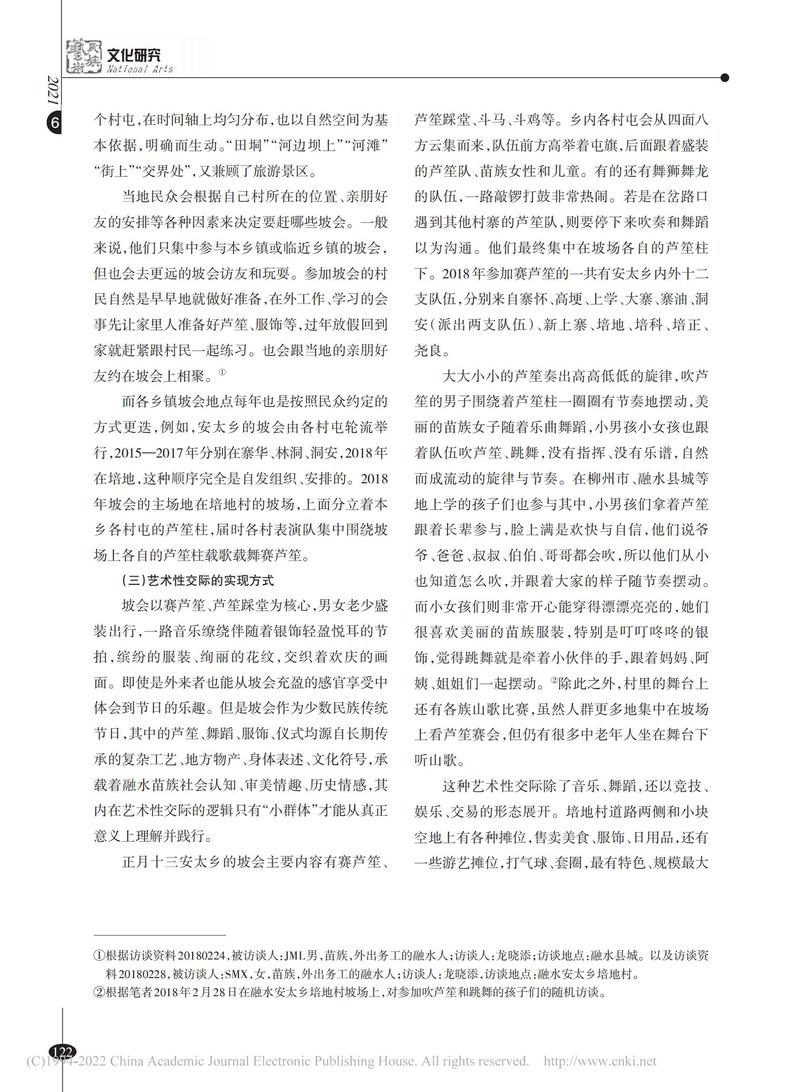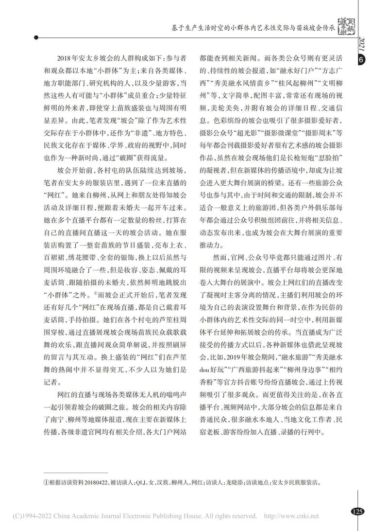 广西师范大学文学院/新闻与传播学院副教授、广西高校人文社科重点研究基地桂学研究院研究员龙晓添老师于《民族艺术》2021年第6期发表《基于生产生活时空的小群体内艺术性交际与苗族坡会传承》一文。文章指出,阿默思将民俗定义为“小群体内的艺术性交际”,从交际过程和行为角度强调面对面才能实现对民俗的建构与理解,其定义被认为推进了将民俗视为行为的研究。广西融水苗族自治县的坡会基于生产生活时空以艺术性交际的方式传承,纳入非物质文化遗产保护范围后,吸引了更多的关注,也面临着各种挑战。而随着网络社会进程的加深,新的传播形式和环境引领其走向更大的舞台。当代坡会正跨时空建构着新的意义与秩序,“小群体”所凝聚的历史感和认同感有助于弥合社会高速发展的冲击,同时,大舞台也为坡会构建了良好的发展环境,坡会的独特性使“小群体”在更大的社会结构中重新认识其价值和意义。