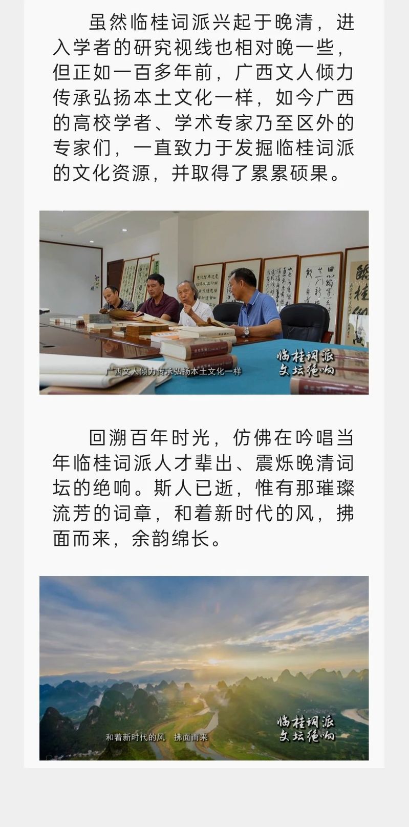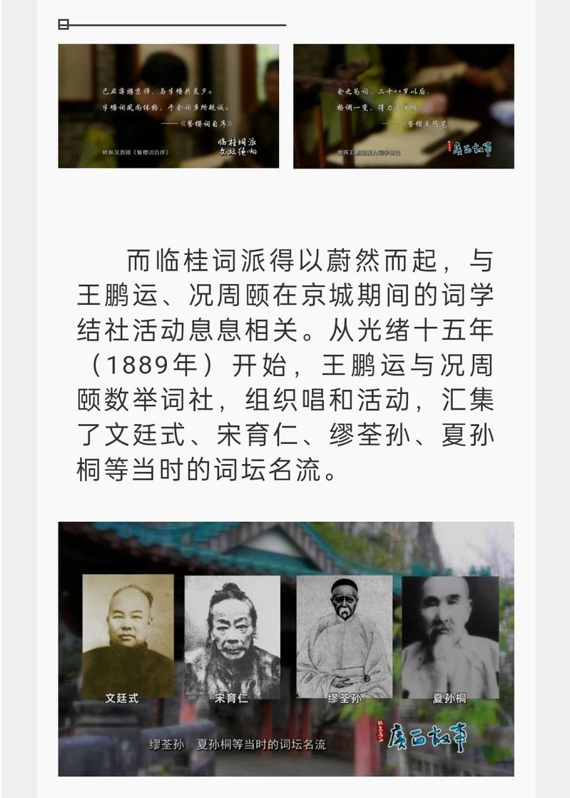 这一期节目的内容是介绍广西文学史上在全国影响最大的一个词派——临桂词派,主要讲述了晚清时期桂林籍的词人王鹏运、况周颐等的创作、贡献和影响。这是广西师范大学中华优秀传统文化传承发展中心(国学中心)、桂学研究院推动挖掘广西地方文化丰厚资源、继承和弘扬中华优秀传统文化的重要成果。