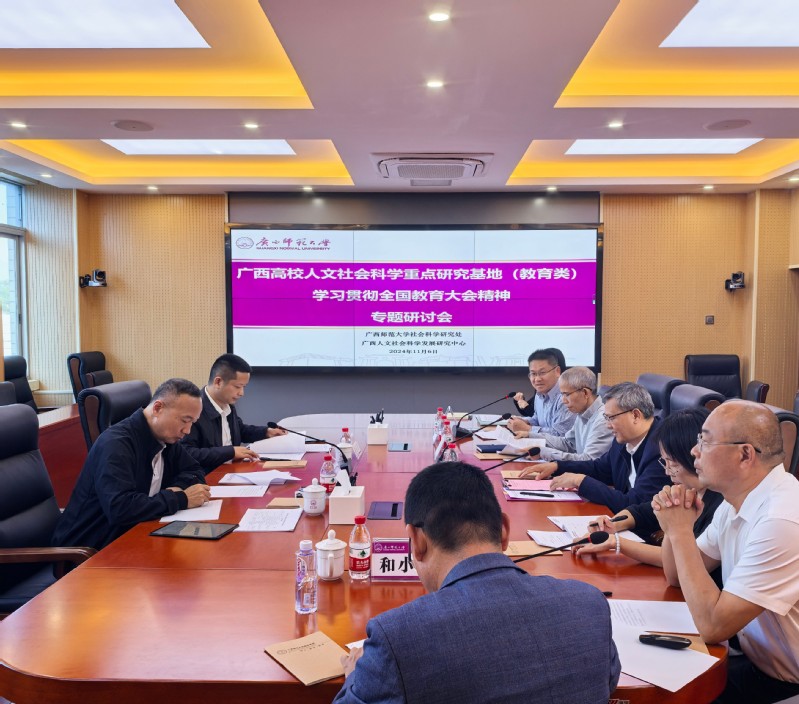 为深入学习贯彻党的二十届三中全会和习近平总书记在全国教育大会上的重要讲话精神,加强《论教育》和全国教育大会精神研究阐释,切实发挥广西高校人文社会科学重点研究基地有组织科研的载体作用,2024年11月6日,由自治区教育厅主办、广西人文社会科学发展研究中心承办的广西高校人文社会科学重点研究基地(教育类)学习贯彻全国教育大会精神专题研讨会,在广西师范大学育才校区田家炳教育书院420室举行。来自全区4所高校新一轮建设的5个广西高校人文社科重点研究基地(教育类)的负责人、科研骨干代表,以及全区部分高校社会科学科研管理部门负责人等10余人参加会议。自治区教育厅科研处处长黄青云,广西教育研究院院长、广西教育科学规划领导小组办公室主任谢凌凌,广西师范大学党委常委、副校长宋树祥出席会议并讲话。