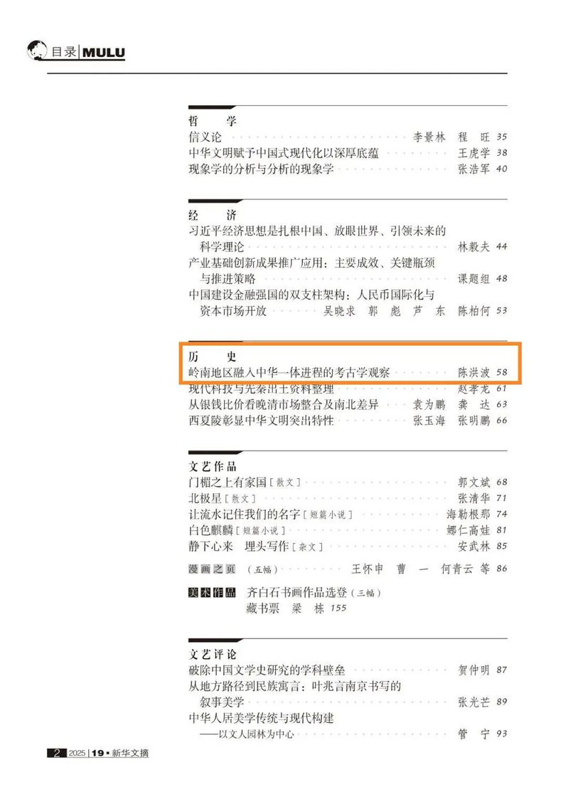 近日,广西师范大学历史文化与旅游学院教授、广西高校人文社科重点研究基地-华南边疆与周边国家研究中心研究员陈洪波发表在《中华民族共同体研究》2025年第2期上的学术论文《岭南地区融入中华一体进程的考古学观察》,被《新华文摘》2025年第19期全文转载。《新华文摘》由国家新闻出版署主管、人民出版社主办、新华文摘杂志社编辑出版,是大型理论性、综合性、资料性文摘类权威期刊。现转发于此,以飨读者。