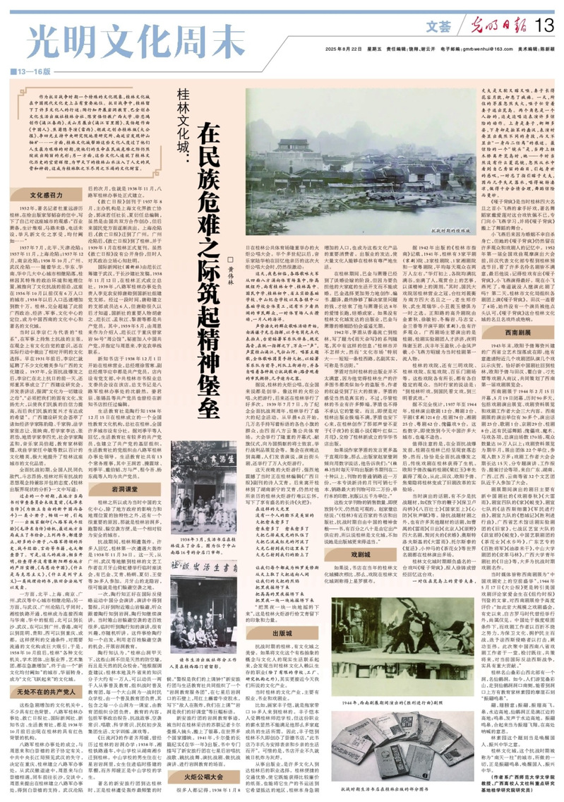 《光明日报》2025年08月22日13版整版刊载了广西师范大学文学院/新闻与传播学院教授、广西高校人文社会科学重点研究基地-桂学研究院研究员黄伟林的文章《桂林文化城:在民族危难之际筑起精神堡垒》。现将全文转载。